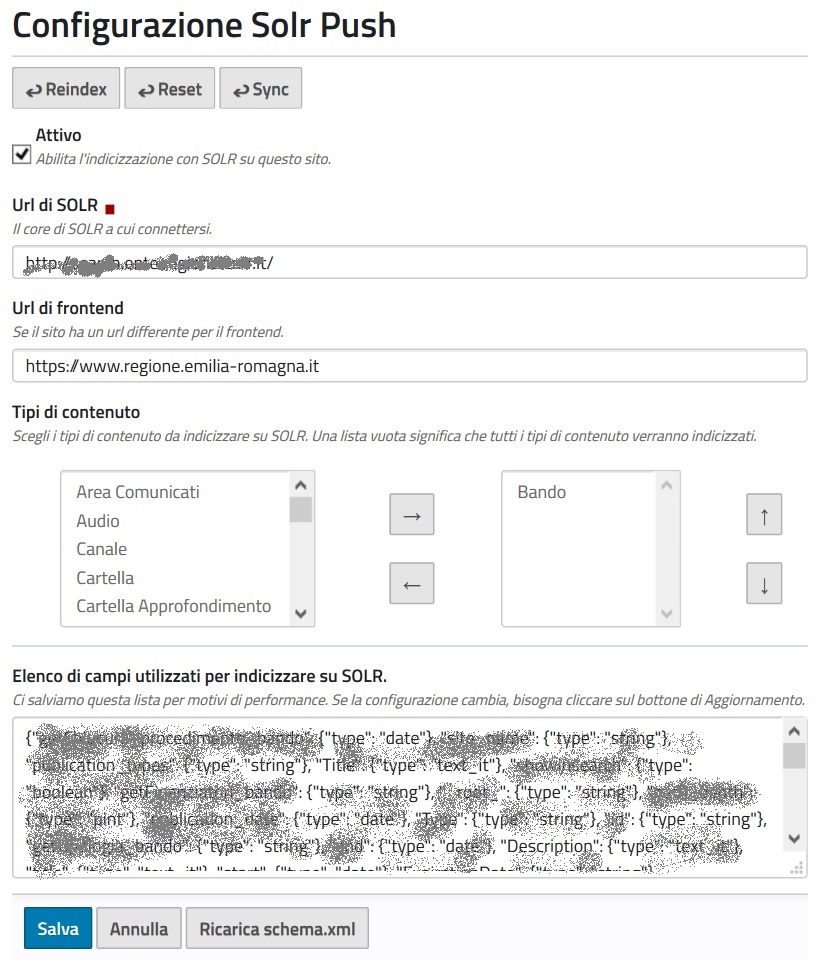 I campi di SOLR sono letti direttamente dal schema.xml esposto da SOLR. Questo schema è salvato nel registry di Plone per questioni di performance ed è sempre sincronizzato quando vengono salvate le configurazioni nel pannello di controllo o si clicca manualmente sul bottone "Ricarica schema.xml".