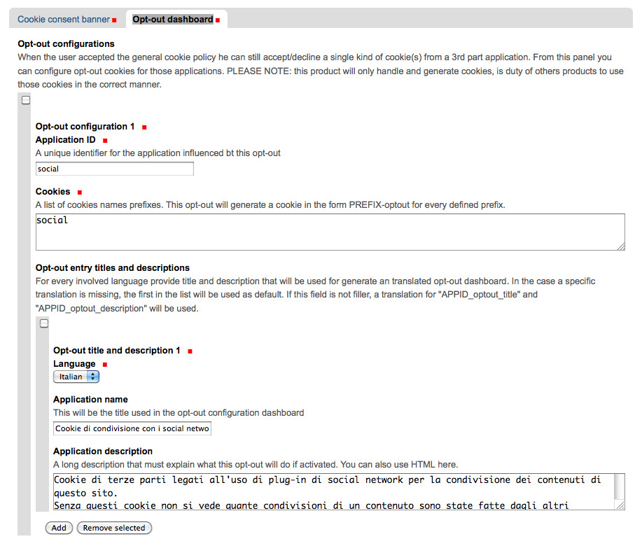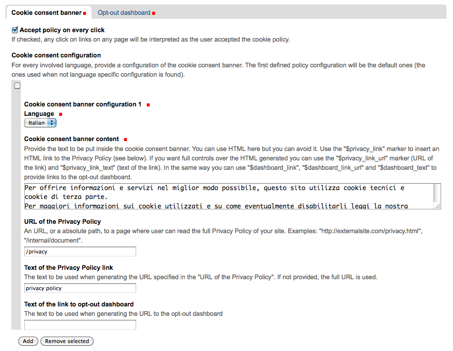 - Una dashboard di opt-out per consentire all’utente di accettare / rifiutare singoli cookie