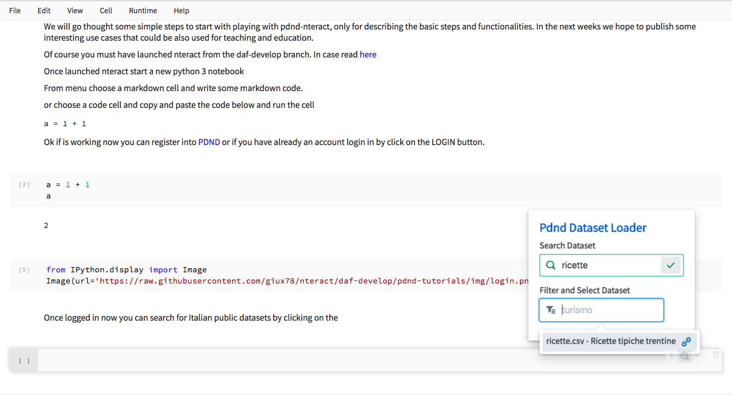 This is a branched (daf-*) fork of nteract, a React user interface on top of Jupyter server. We have developed an integration of the API from PDND - DAF (Piattaforma Digitale Nazionale Dati, formerly Data & Analytics Framework) for simplyfing the access to Italian public data inside notebook for data analysis. We are developing a set of UI components integrated into a set of the official API to read, save and **update **data into PDND. User can search for datasets from PDND load into a dataframe and starting working on it. The tool is very powerful and flexible and can be an easy way to start working on public dataset from italian administrations, making simple analysis and reports.