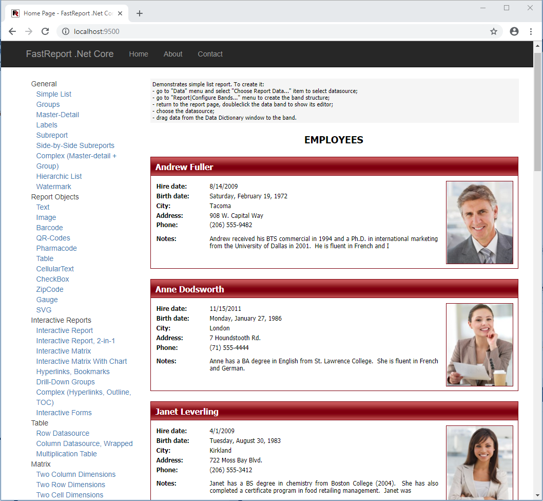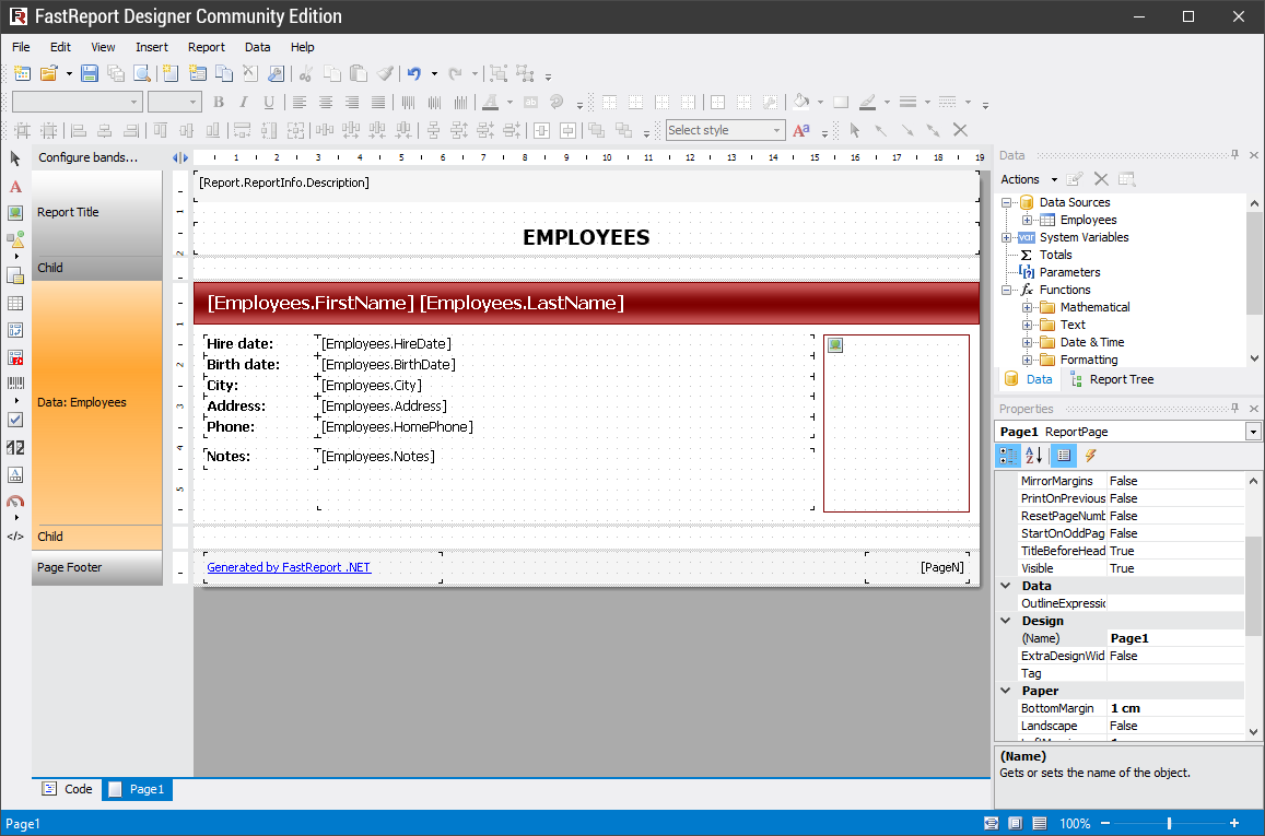 FastReport provides open source report generator for .NET Core/.NET Framework. You can use the FastReport in MVC, Web API applications. FastReport is written in C# and it is compatible with .NET Standard 2.0 and higher. Extendable FastReport architecture allows creating your own objects, export filters, wizards and DB engines. You can get data from XML, CSV, Json, MS SQL, MySql, Oracle, Postgres, MongoDB, Couchbase, RavenDB, SQLite. FastReport has a built-in script engine that supports two .NET languages, C# and VB.NET. You can use all of the .NET power in your reports to perform complex data handling and much more. You can make a report template in several ways:creating report from code, developing report template as XML file, using the FastReport Online Designer, using the FastReport Designer Community Edition (freeware). FastReport Open Source can save documents in HTML, BMP, PNG, JPEG, GIF, TIFF, EMF. PDF Export is available as a plugin.