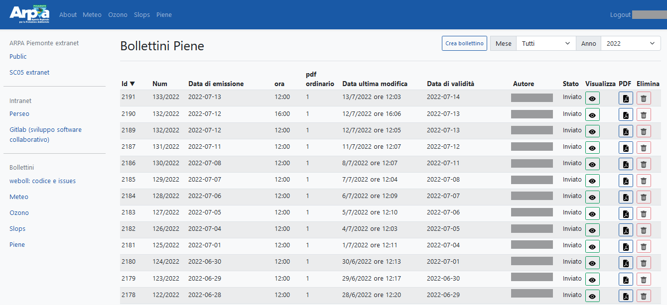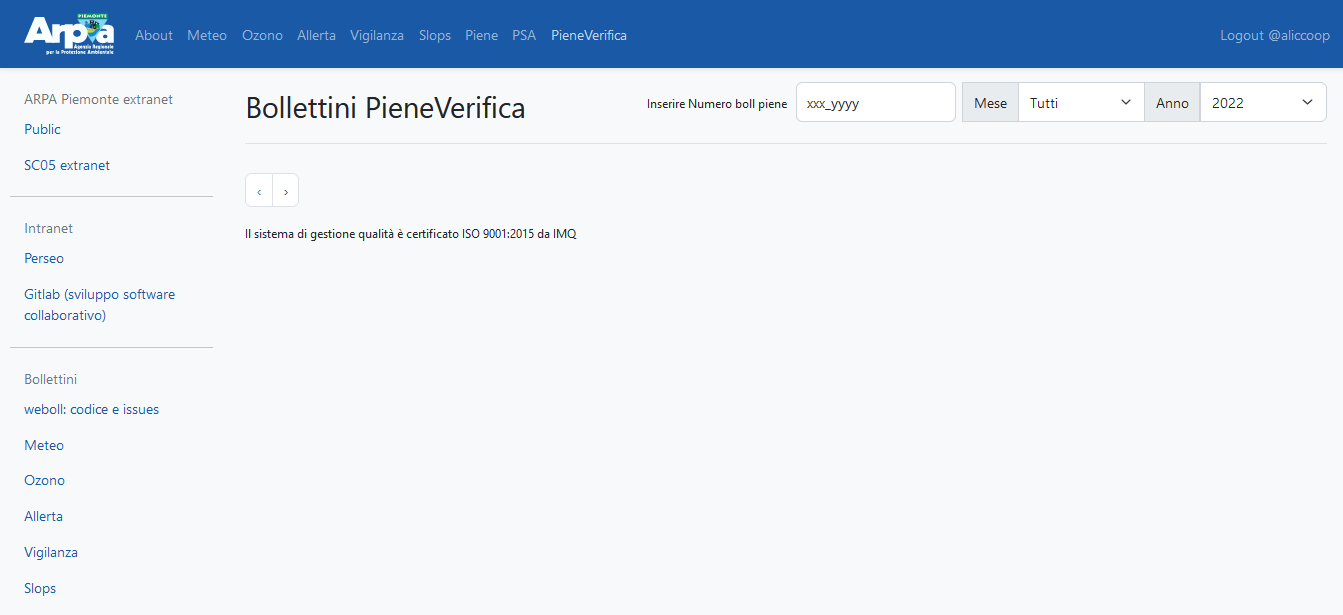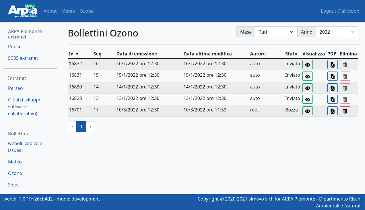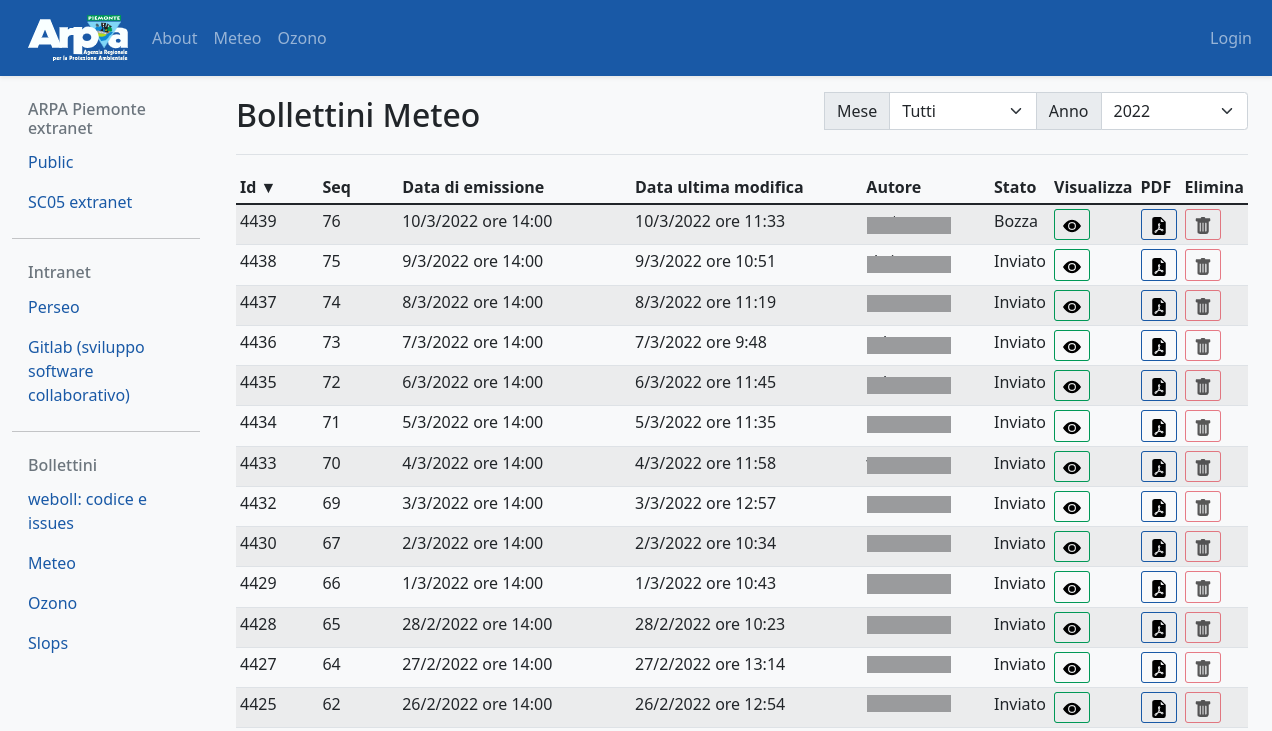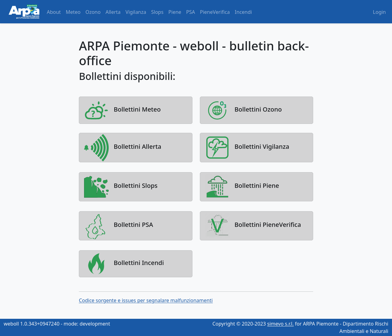 Weboll is the back-office for producing the forecast bulletins included in the operational and institutional activities of the Environmental and Natural Hazards Department of Arpa Piemonte. It supports the following bulletins: Weather forecasts, Ozone, Alert, Vigilance, Slops, Floods, Forecast on Alert Zones, Flood check, Fires. It is a dockerized three-tier web application with: - PostegreSQL relational database - Django / Django REST framework backend - Responsive and reactive frontend based on Vue.js and bootstrap.