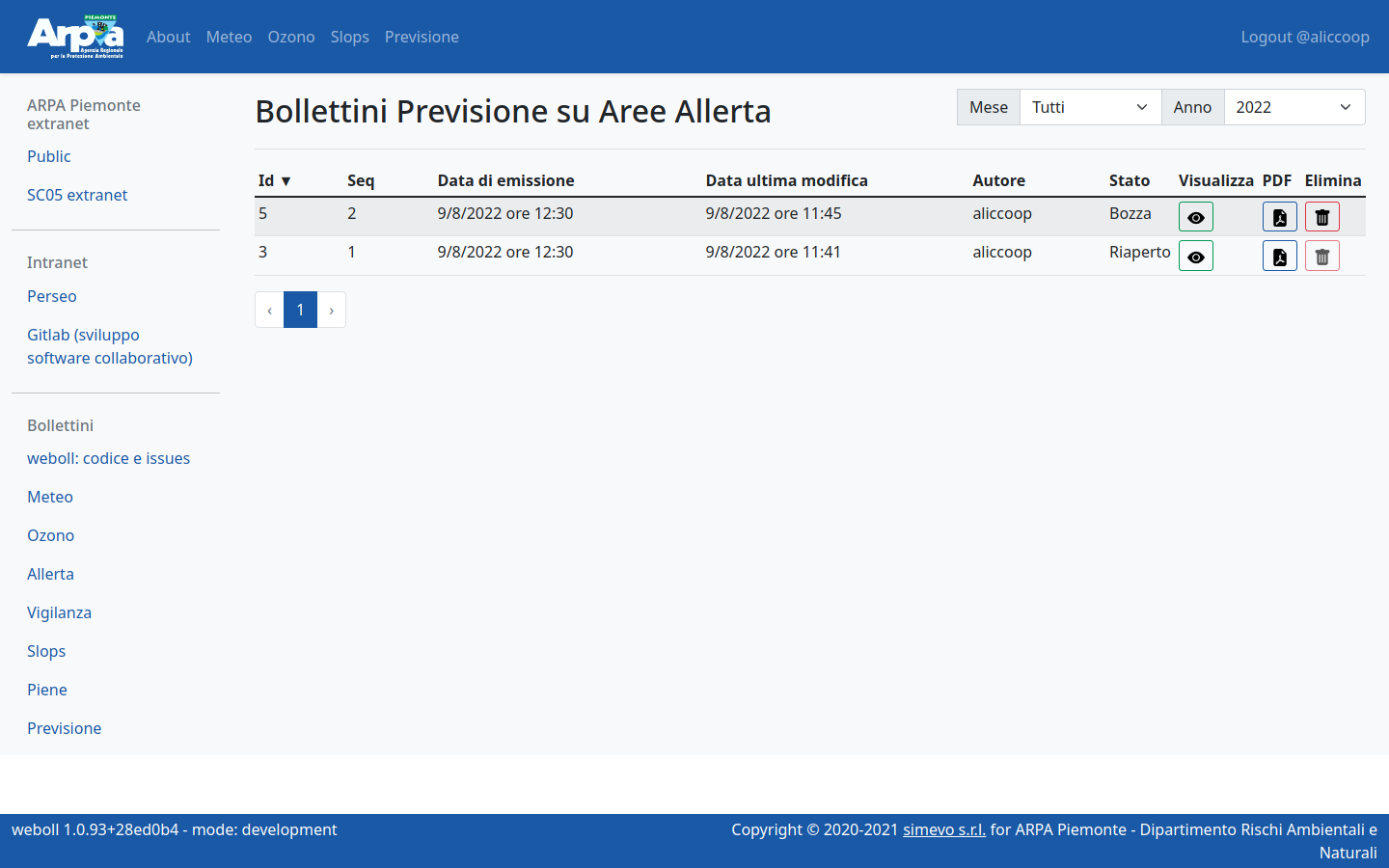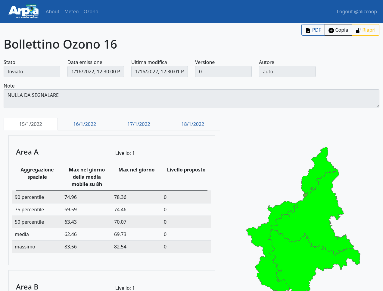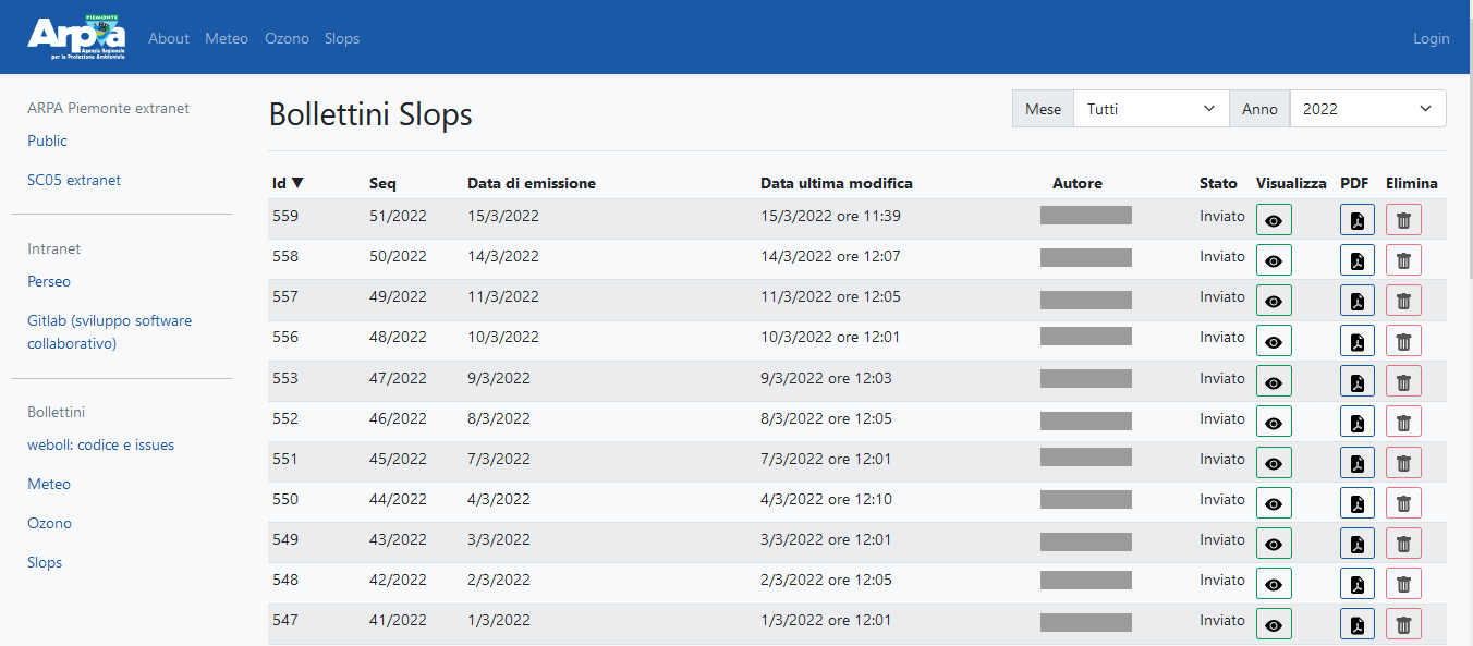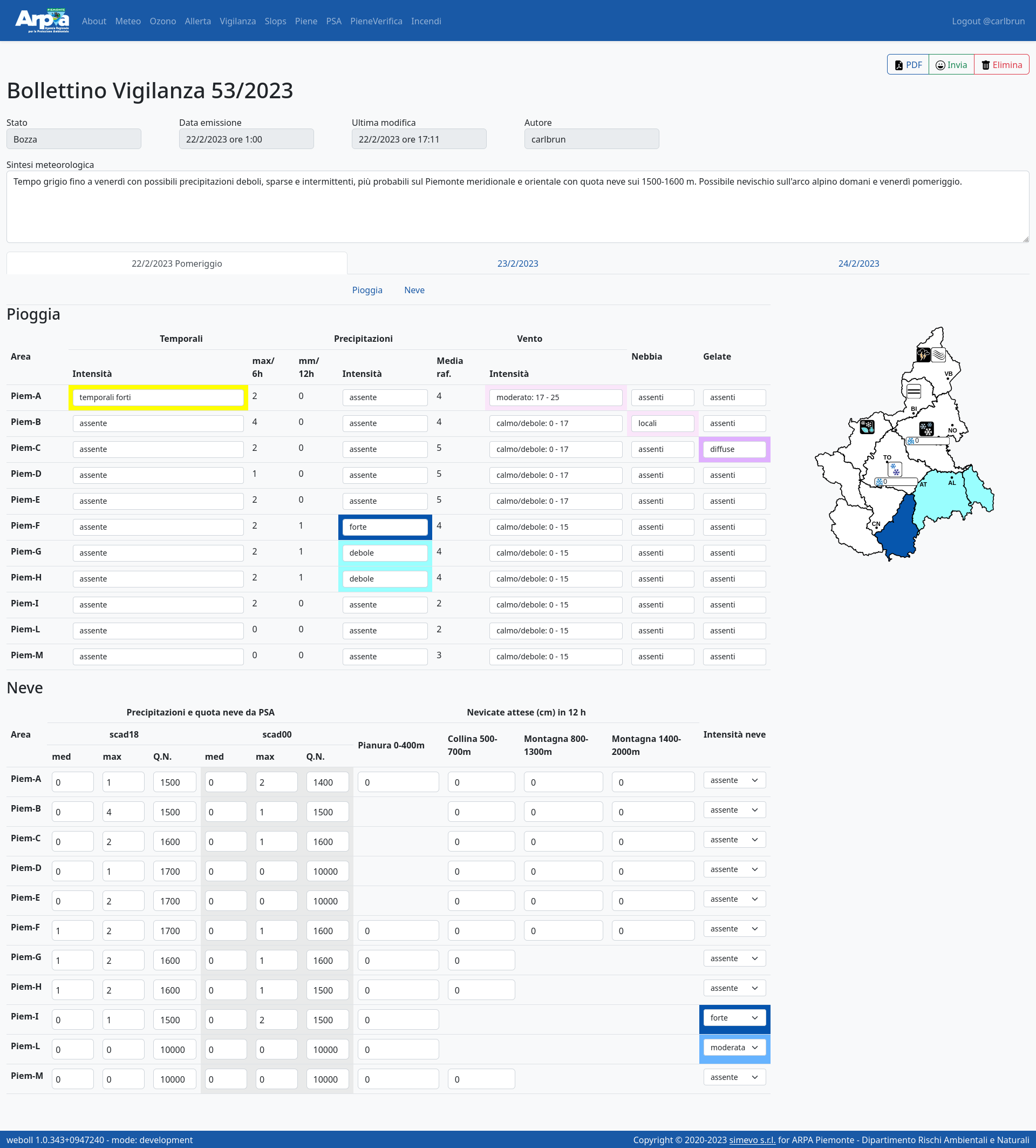 Weboll is the back-office for producing the forecast bulletins included in the operational and institutional activities of the Environmental and Natural Hazards Department of Arpa Piemonte. It supports the following bulletins: Weather forecasts, Ozone, Alert, Vigilance, Slops, Floods, Forecast on Alert Zones, Flood check, Fires. It is a dockerized three-tier web application with: - PostegreSQL relational database - Django / Django REST framework backend - Responsive and reactive frontend based on Vue.js and bootstrap.