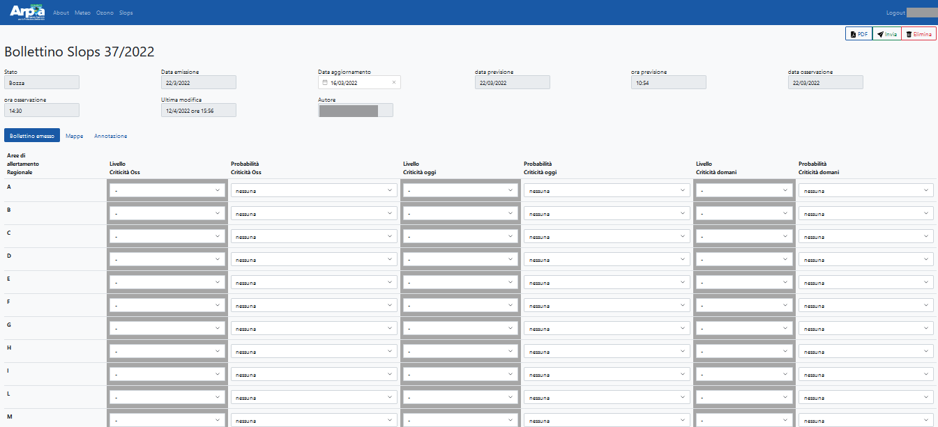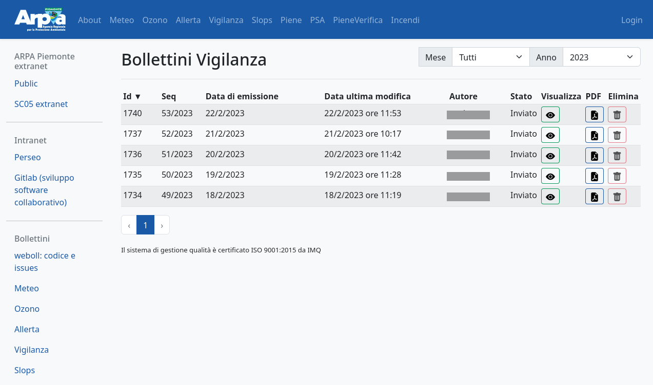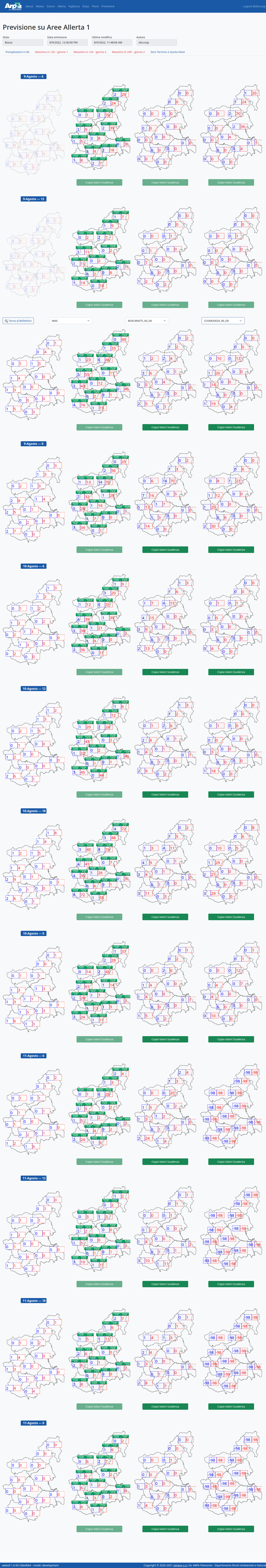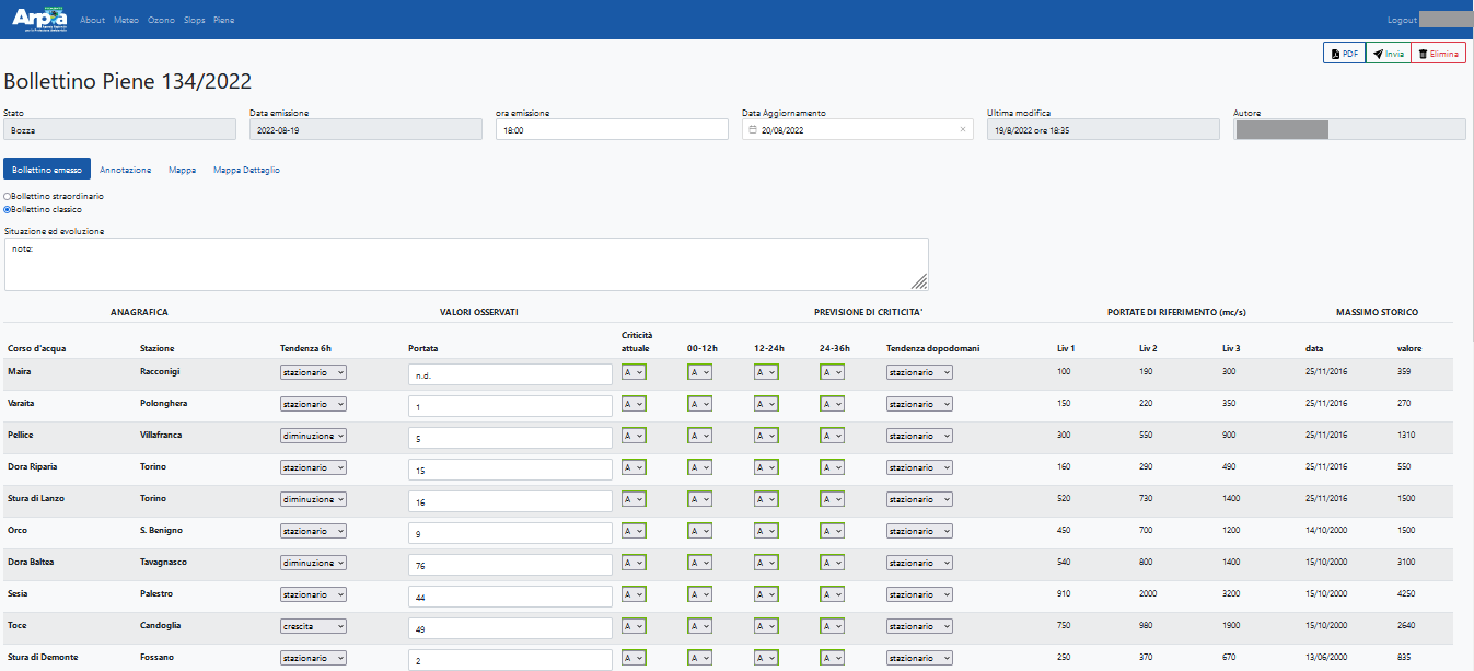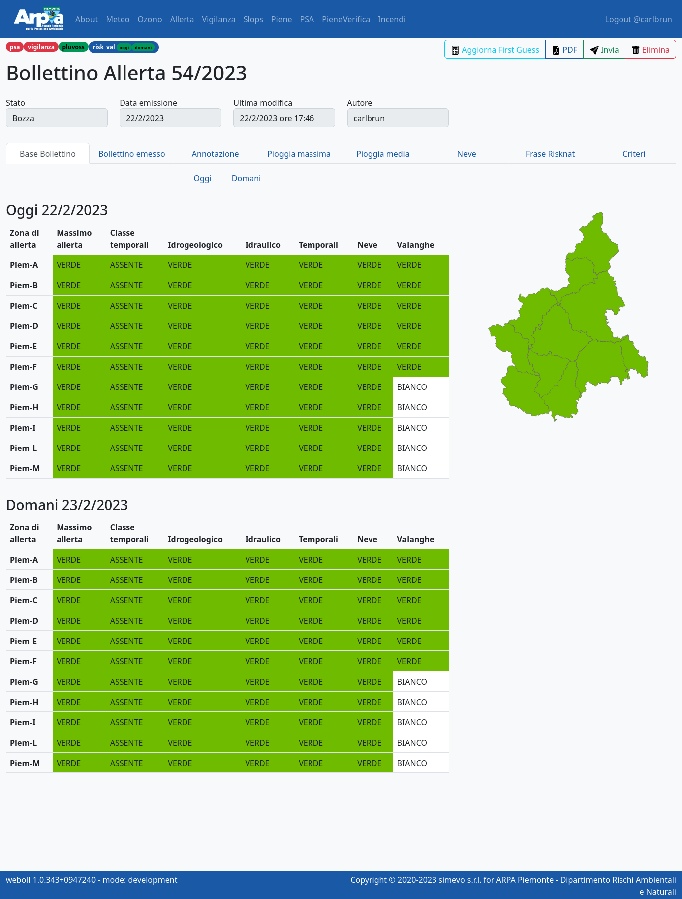 Weboll is the back-office for producing the forecast bulletins included in the operational and institutional activities of the Environmental and Natural Hazards Department of Arpa Piemonte. It supports the following bulletins: Weather forecasts, Ozone, Alert, Vigilance, Slops, Floods, Forecast on Alert Zones, Flood check, Fires. It is a dockerized three-tier web application with: - PostegreSQL relational database - Django / Django REST framework backend - Responsive and reactive frontend based on Vue.js and bootstrap.