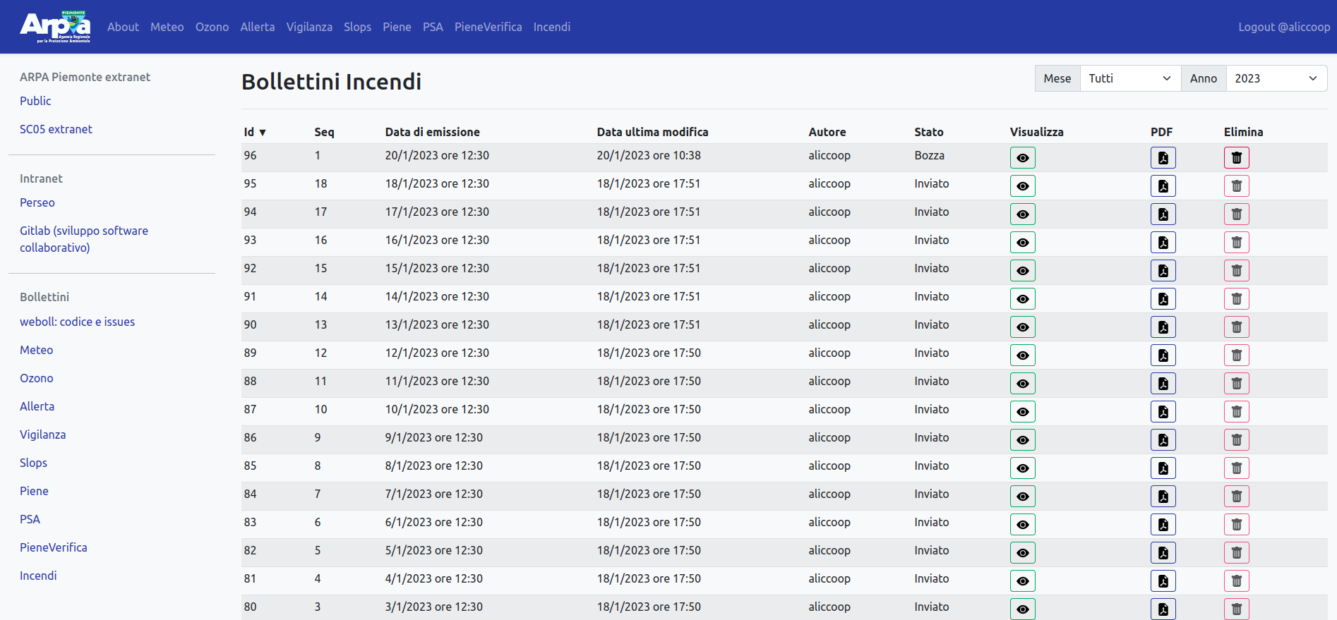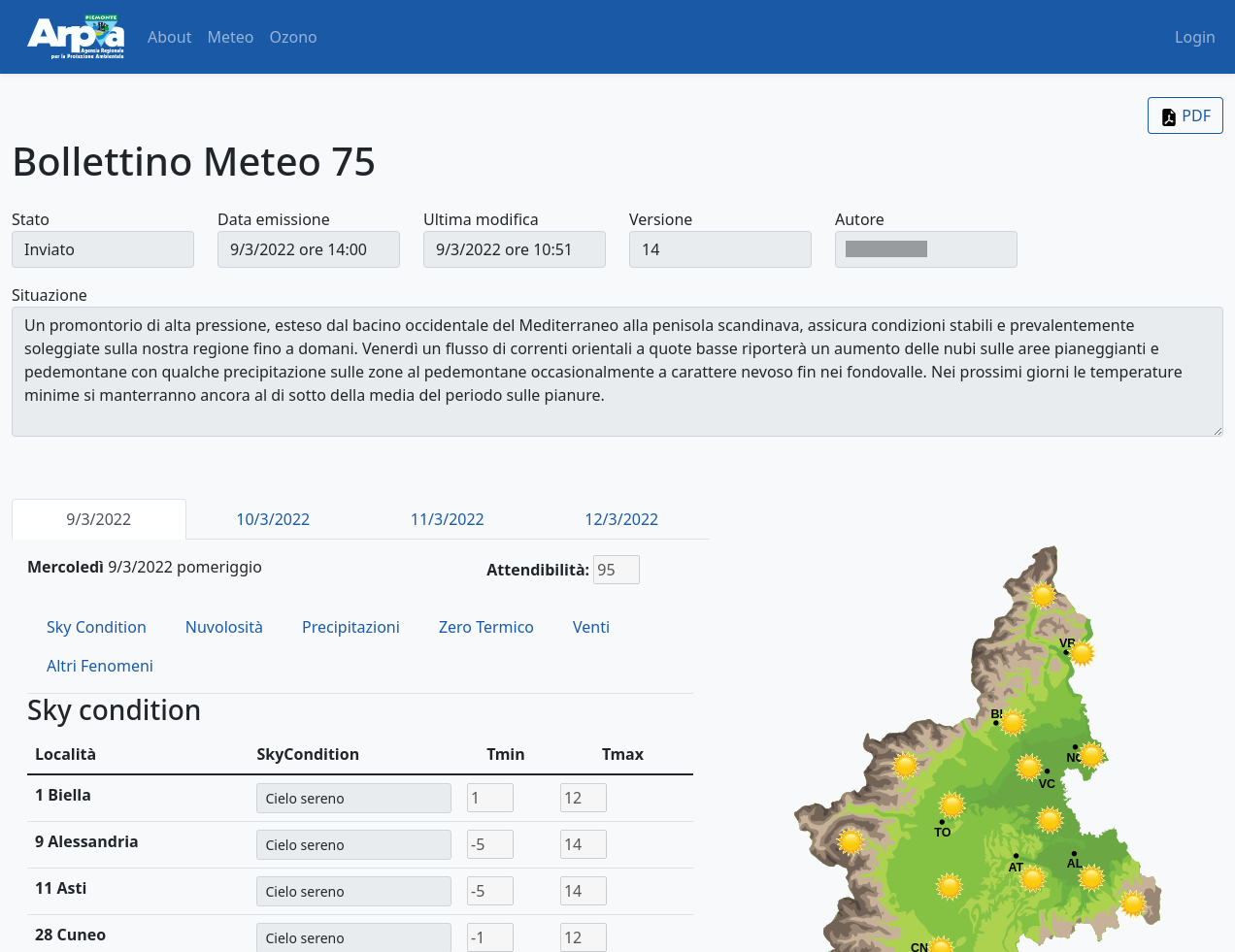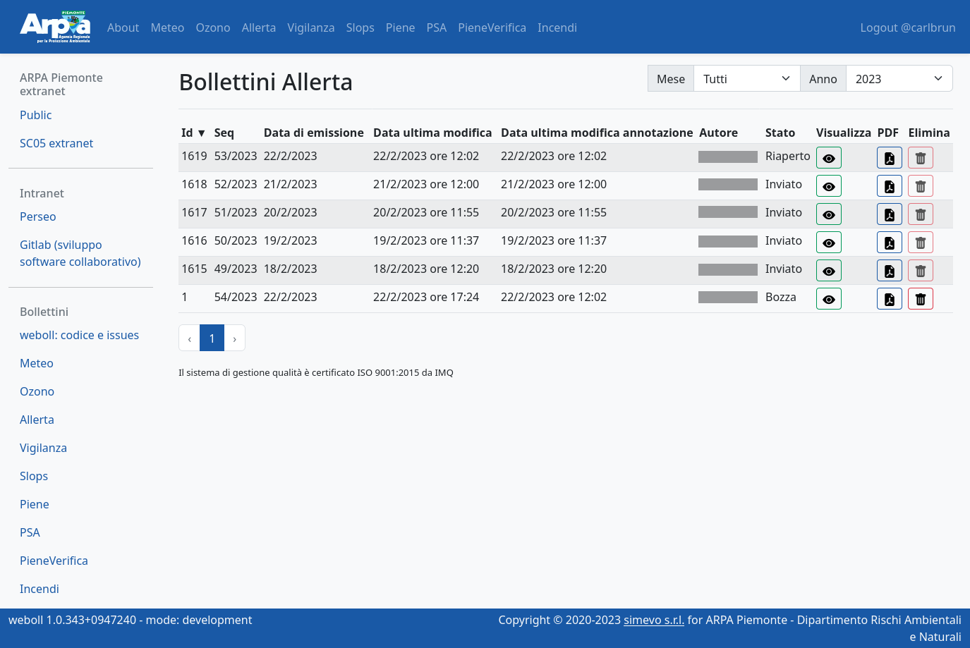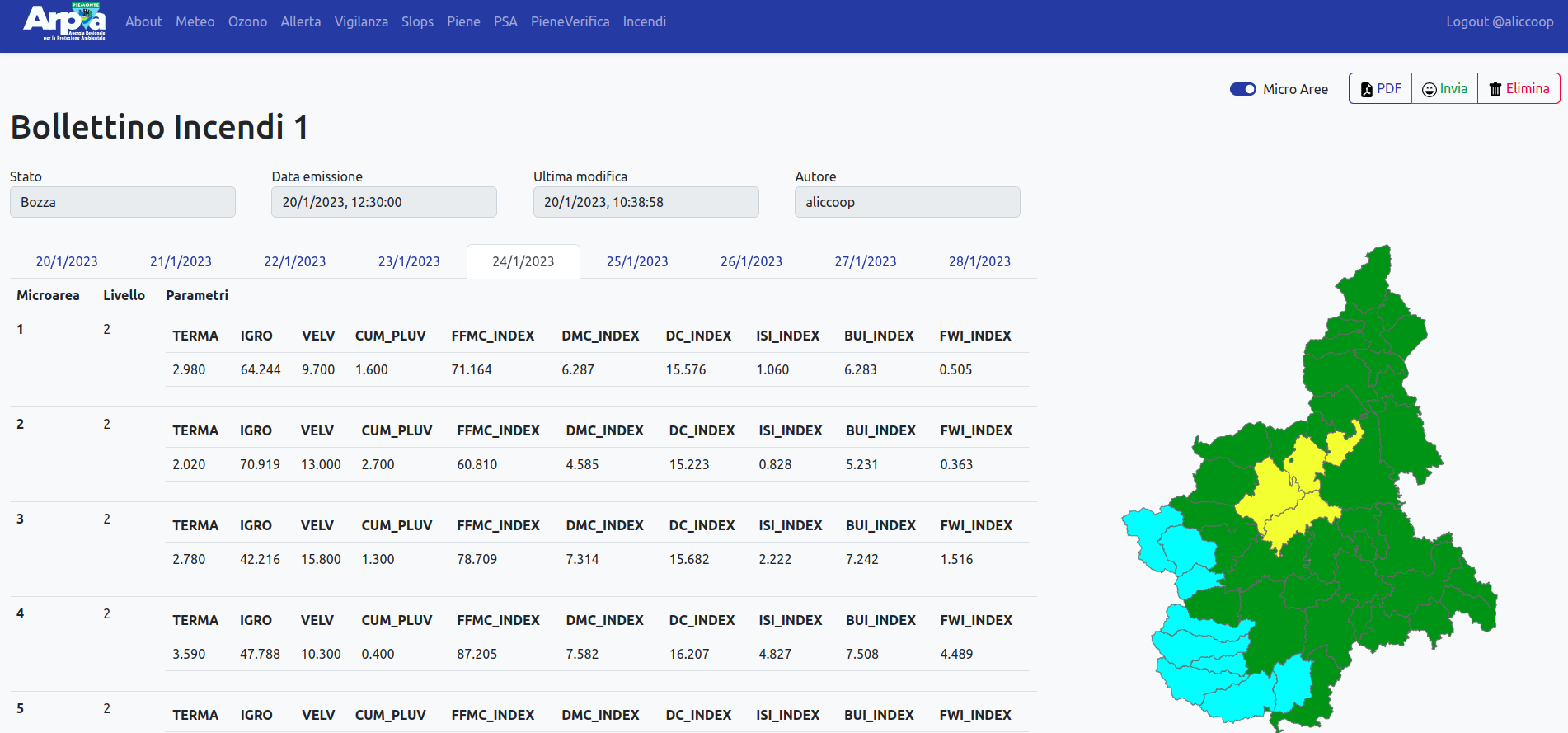 Weboll is the back-office for producing the forecast bulletins included in the operational and institutional activities of the Environmental and Natural Hazards Department of Arpa Piemonte. It supports the following bulletins: Weather forecasts, Ozone, Alert, Vigilance, Slops, Floods, Forecast on Alert Zones, Flood check, Fires. It is a dockerized three-tier web application with: - PostegreSQL relational database - Django / Django REST framework backend - Responsive and reactive frontend based on Vue.js and bootstrap.