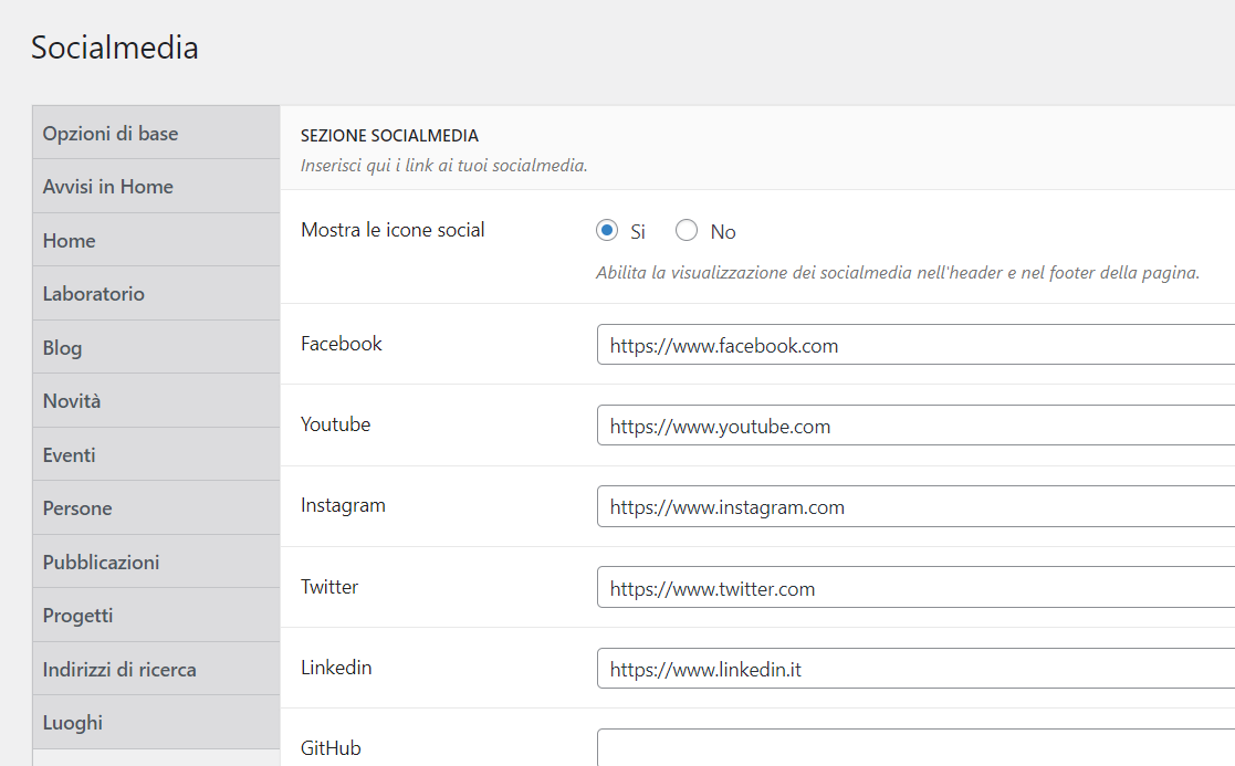 - Sezione per la configurazione del tema e dei contenuti.