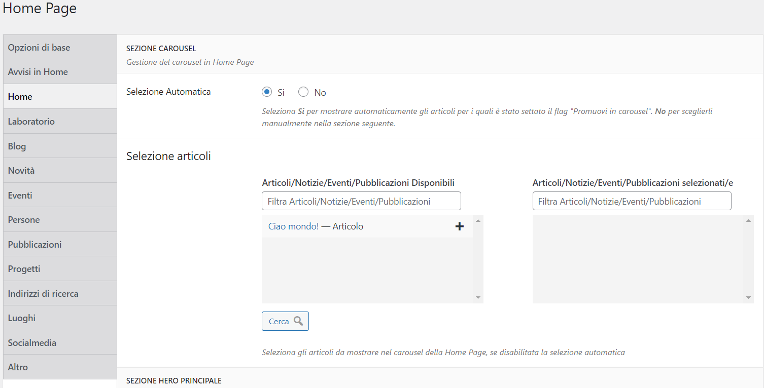 - Carousel in home page con contenuti selezionabili.