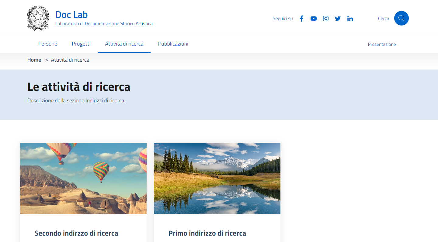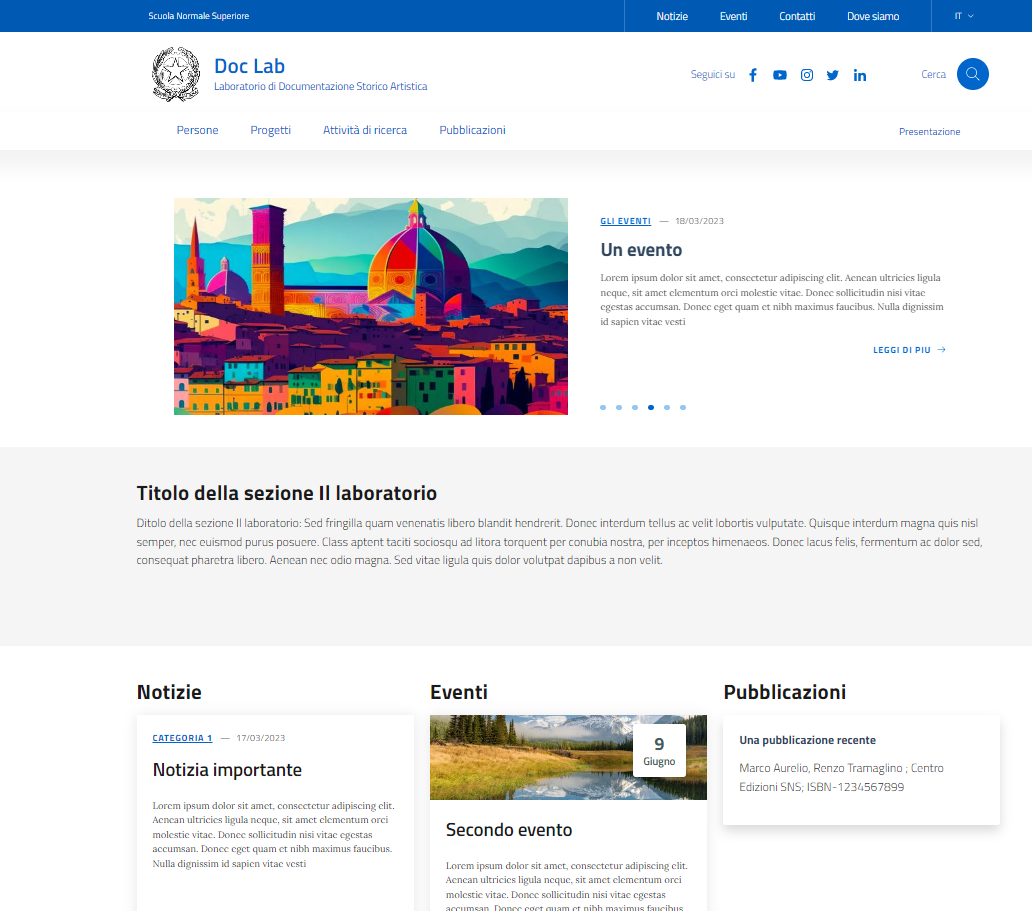 Design laboratori e centri di ricerca è un tema wordpress basato sul modello di siti per le scuole italiane e sviluppato dalla Scuola Normale Superiore con l'obiettivo di creare un modello di sito per le strutture di ricerca (centri e laboratori). Una volta installato, l'ambiente offre una serie di contenuti predefiniti che rendono semplice e veloce l'allestimento del sito. Questo sito permette di pubblicare tutte le informazioni relative ad una struttura di ricerca: personale afferente organizzato per struttura, pubblicazioni, progetti di ricerca, attività di ricerca (aggregazione di progetti) oltre a news ed eventi correlati alle attività. Il progetto si pone l'obiettivo di obiettivo di dare evidenza e valore alle attività e al personale di ricerca delle strutture. E' possibile provare in modo semplice il sistema in locale utilizzando il Dockerfile predente nel sorgente del progetto.