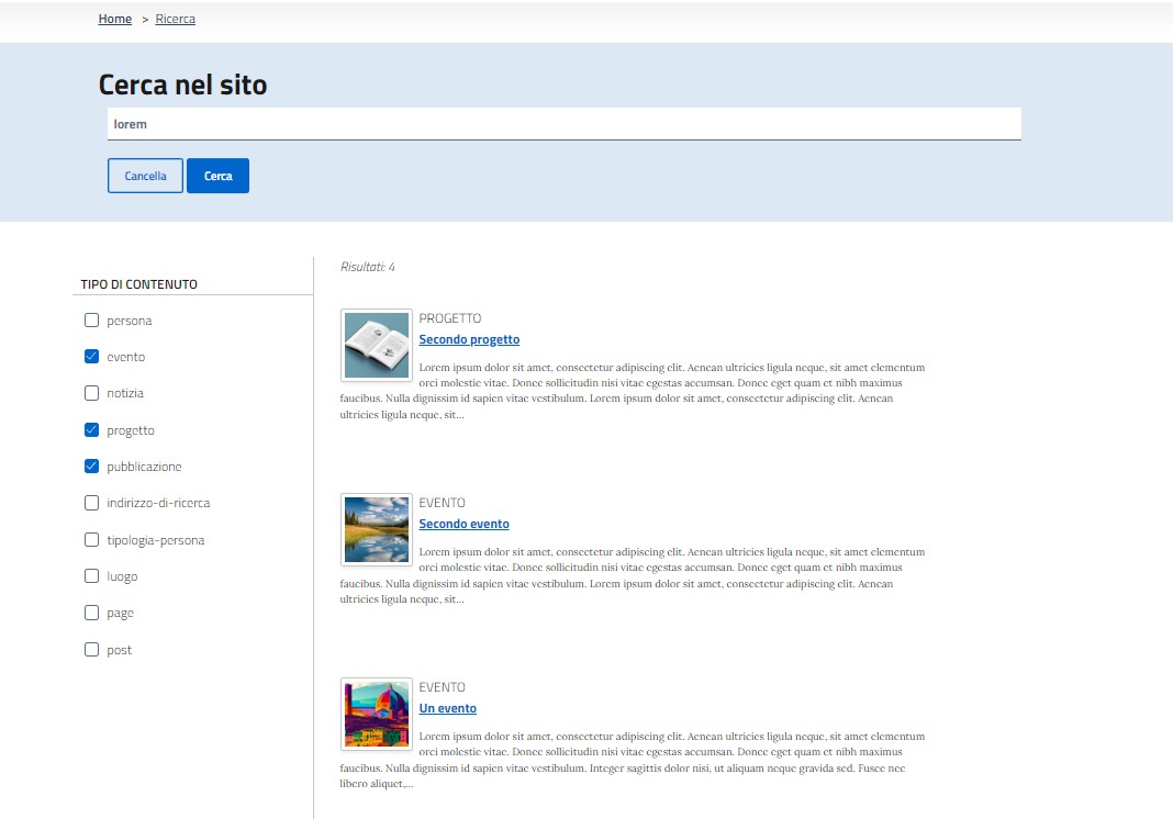 - Ricerca in tutti i contenuti del sito.