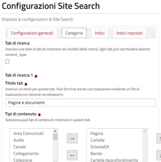 C'è sempre una scheda generica "Tutto" che mostra tutti i risultati della ricerca. In questo pannello di configurazione, è possibile impostare un elenco di schede aggiuntive che raggrupperanno i risultati in base al tipo di contenuto.