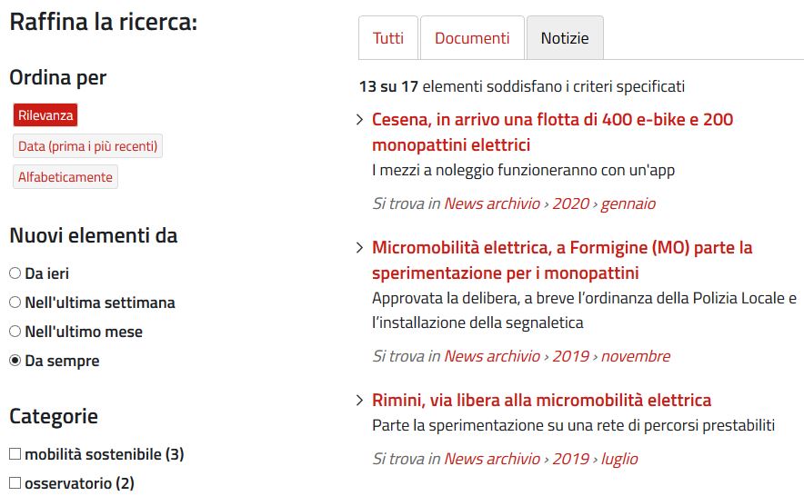La vista di ricerca mostra un elenco di parametri (indici nel catalogo) nella colonna di sinistra per ottimizzare i risultati.