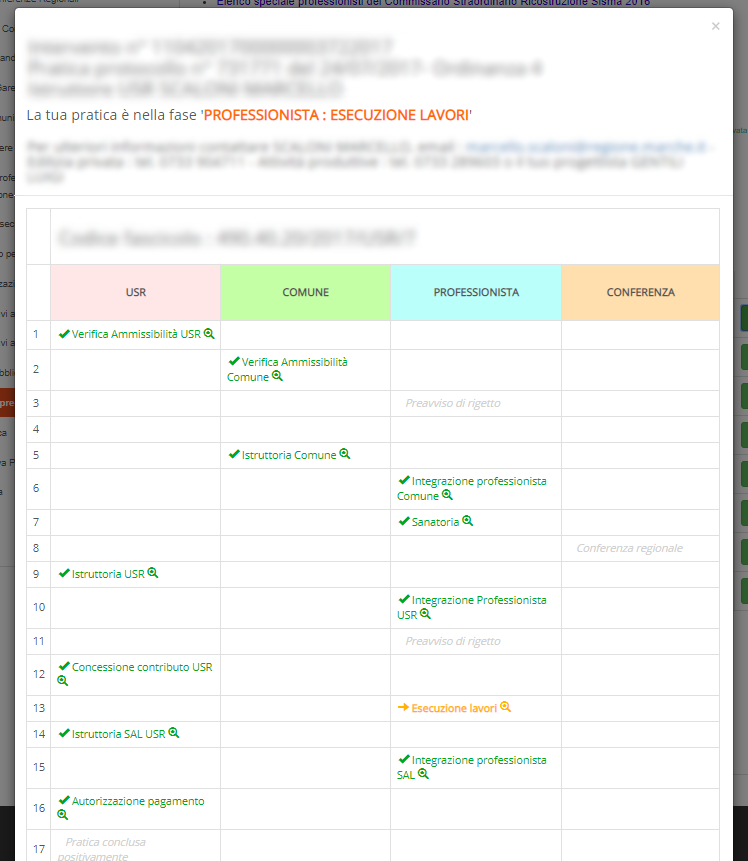 - 19-2017 (Ricostruzione pesante). Accedendo con il codice fiscale dell'intestatario dell'istanza o con la partita IVA dell'impresa appaltatrice, viene presentato il dettaglio dello stato di avanzamento della pratica e dei soggetti presso cui l'esame della documentazione o l'attività di processamento richiesta è in corso (Comune, USR, Conferenza di Servizi, Progettista, etc.). I dati visualizzati vengono estratti dai workflow, dai DB e dai repository del sistema informativo DOMUS di Regione Marche, sintetizzati in una vista e presentati in formato tabellare.